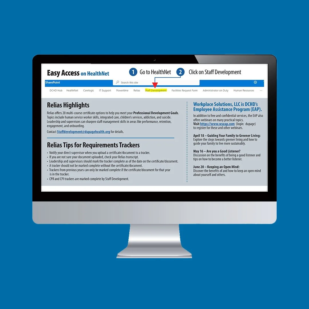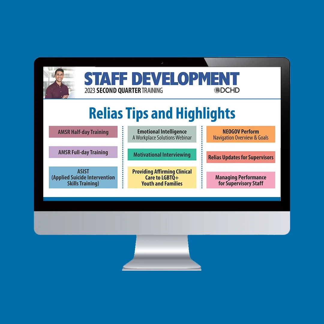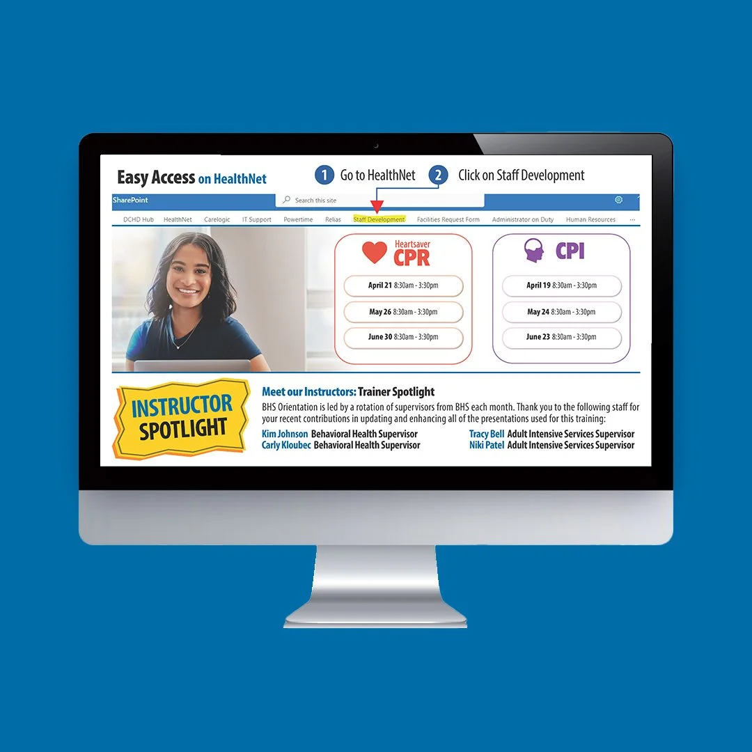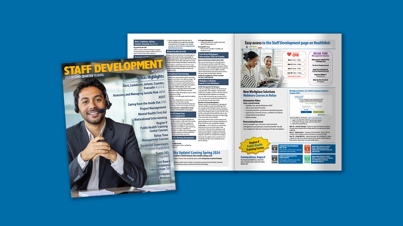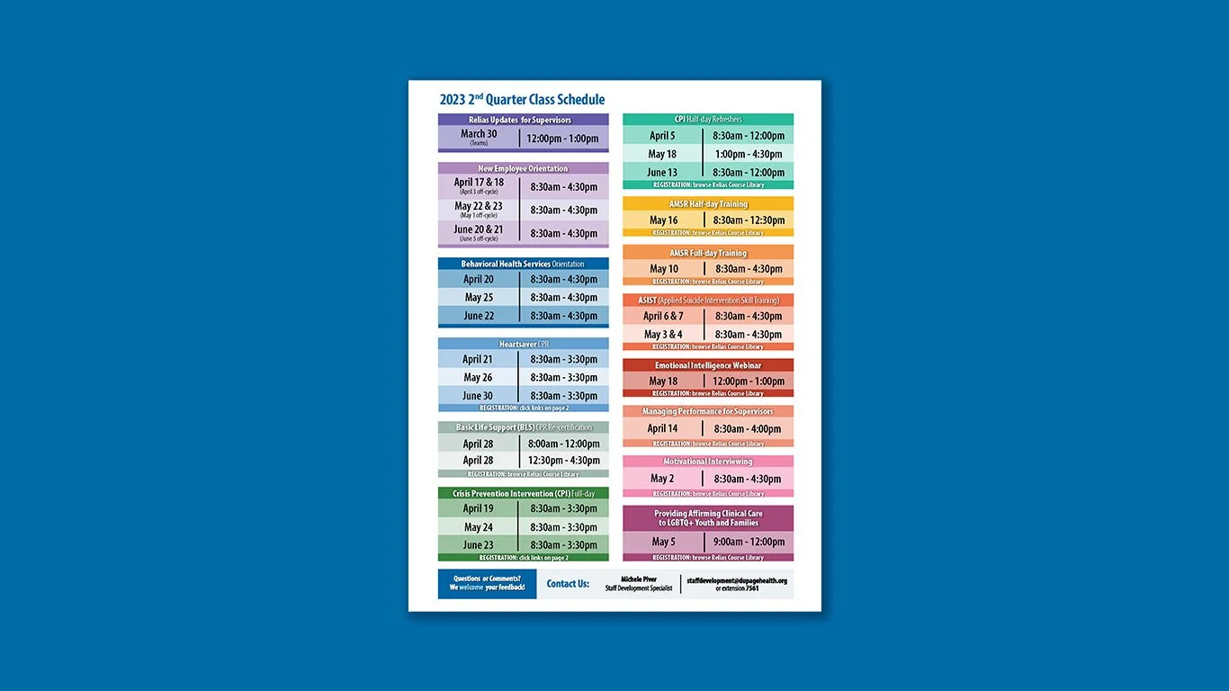 The Department of Behavioral Health at DuPage County has a quarterly newsletter that goes out to all of the employees of the health department. This newsletter includes different classes, events, and trainings, which are made available through links and a schedule calendar. A printed version is also available to employees. It is also converted into a screensaver, which plays on the employees’ computer monitors in the agency.