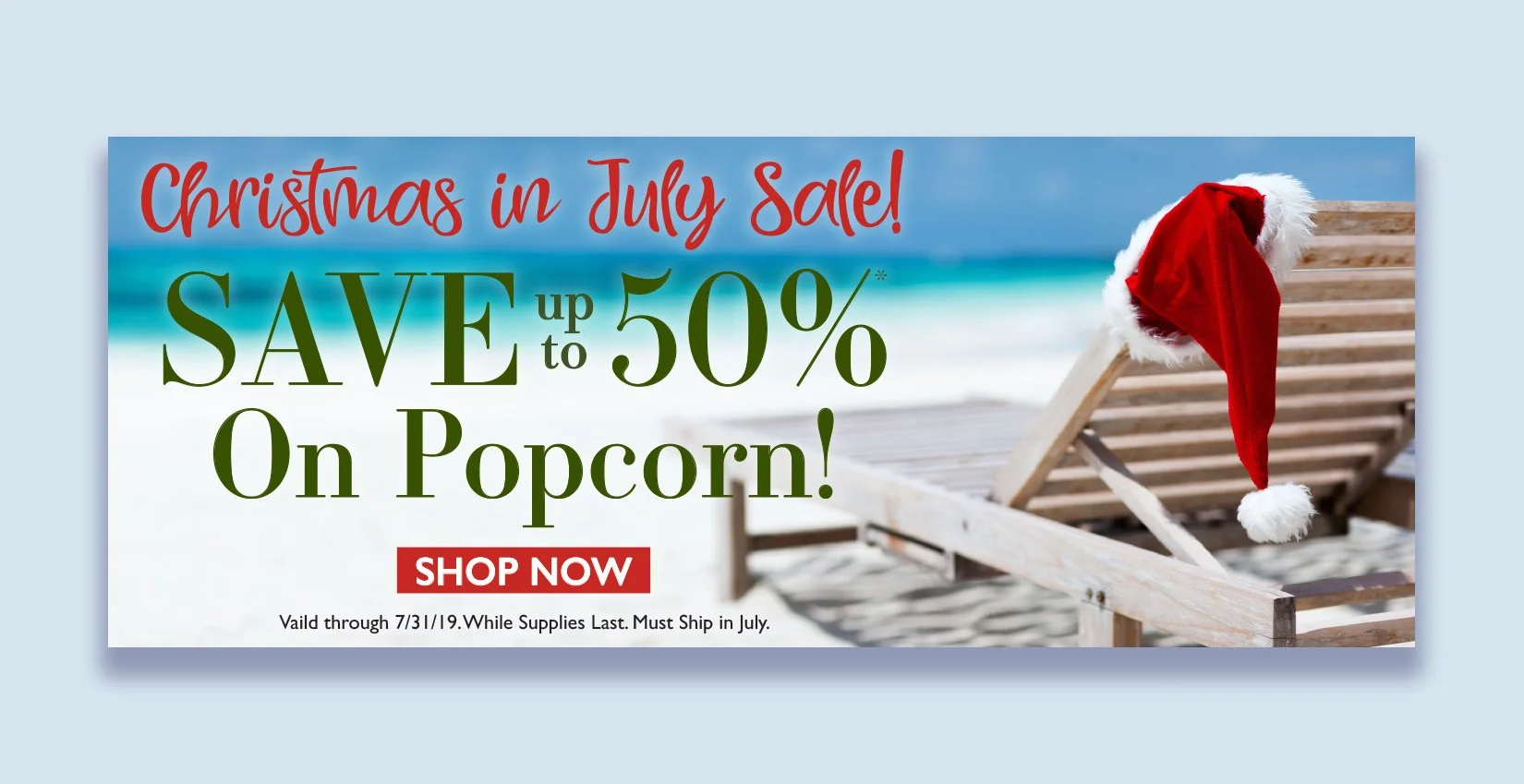 During my time at The Popcorn Factory, I was assigned to create digital banner ads in several sizes for the Christmas in July sale. The goal was for a fun Christmas summer theme. The images chosen focused on the warm weather at the beach with Christmas elements.